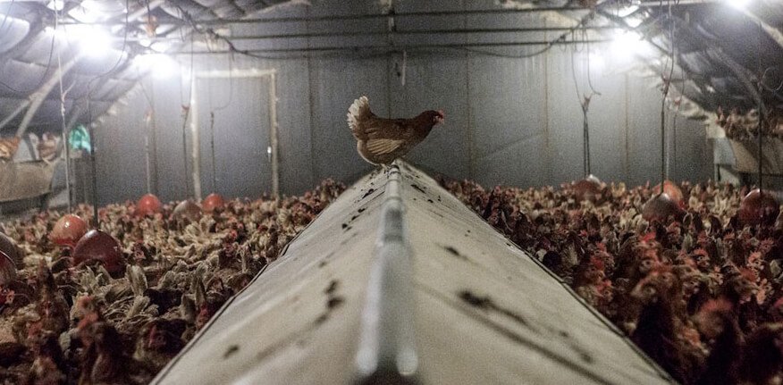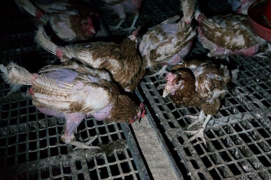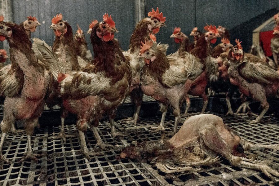 With so many animals crammed into such a small space, competition for food can be fierce. This, as well as other sources of stress, can cause chickens to resort to cannibalism, pecking at the rotting corpses of their dead flockmates.