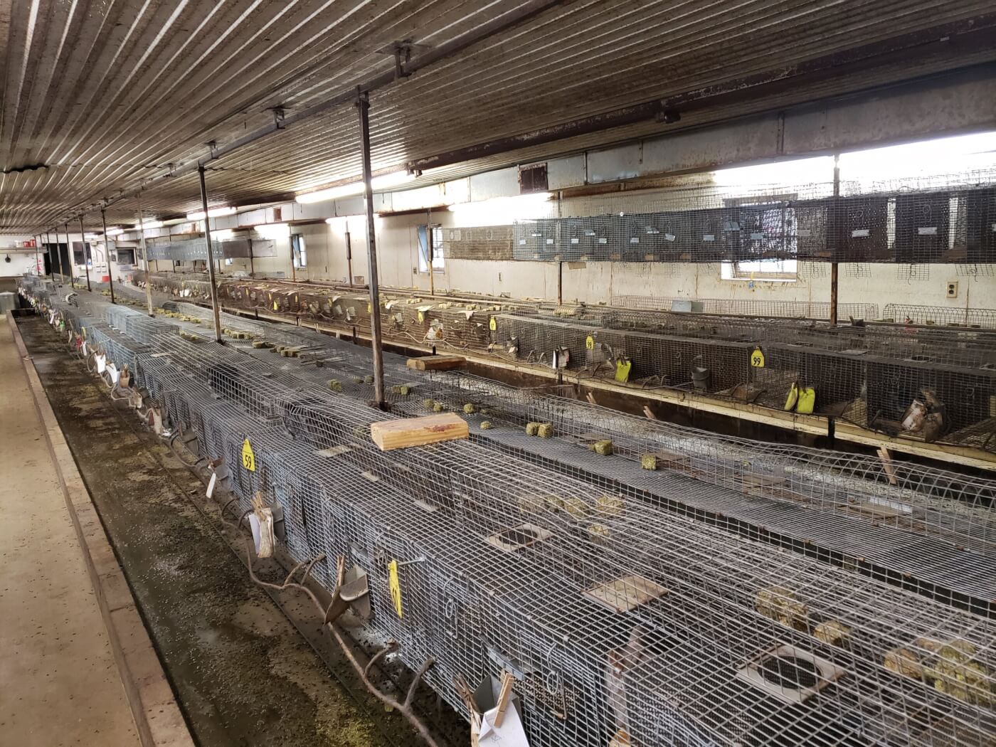 Chinchillas, who love to run and climb, are confined 24/7 to small, rusty, wire-floored cages in a long shed reeking of ammonia.