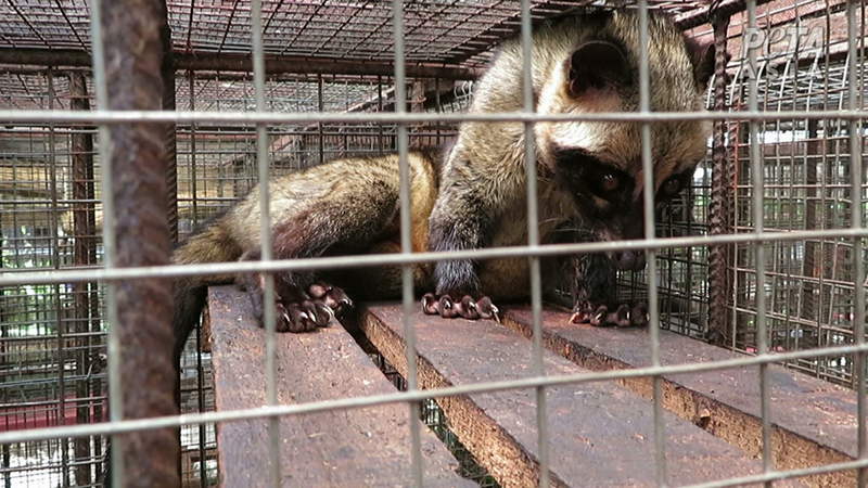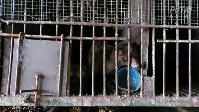 PETA Asia investigators visited kopi luwak farms and found disturbing cruelty on every one. Nocturnal civet cats, who naturally fear humans, were confined to small wire cages with no dark place to sleep and were subjected to a constant barrage of unwanted human contact. Their cages were encrusted with feces, rotting berries, and other filth, and they panted incessantly in the heat. Numerous civet cats exhibited signs of extreme psychological distress, including pacing and biting themselves. Investigators saw several with open, bloody wounds, but the animals didn’t appear to receive any veterinary care. At least one appeared to be blind.