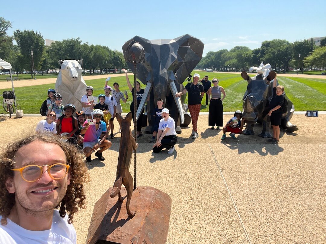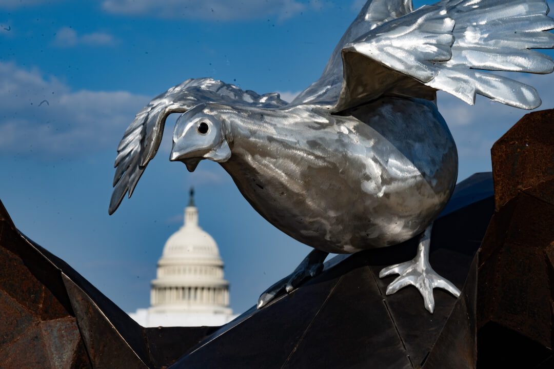 From July 13 through September 3, 2023, the thought-provoking multimedia exhibit—a towering steel and aluminum work featuring a polar bear, an elephant, a rhinoceros, a chicken, and a coyote—was be on display on the National Mall in Washington, D.C. The exhibit was located just blocks away from the U.S. Capitol as a call to the country’s leaders and the public that we must learn to coexist peacefully with our fellow animals and not exploit them, which means acting on the realization that their lives and interests matter.