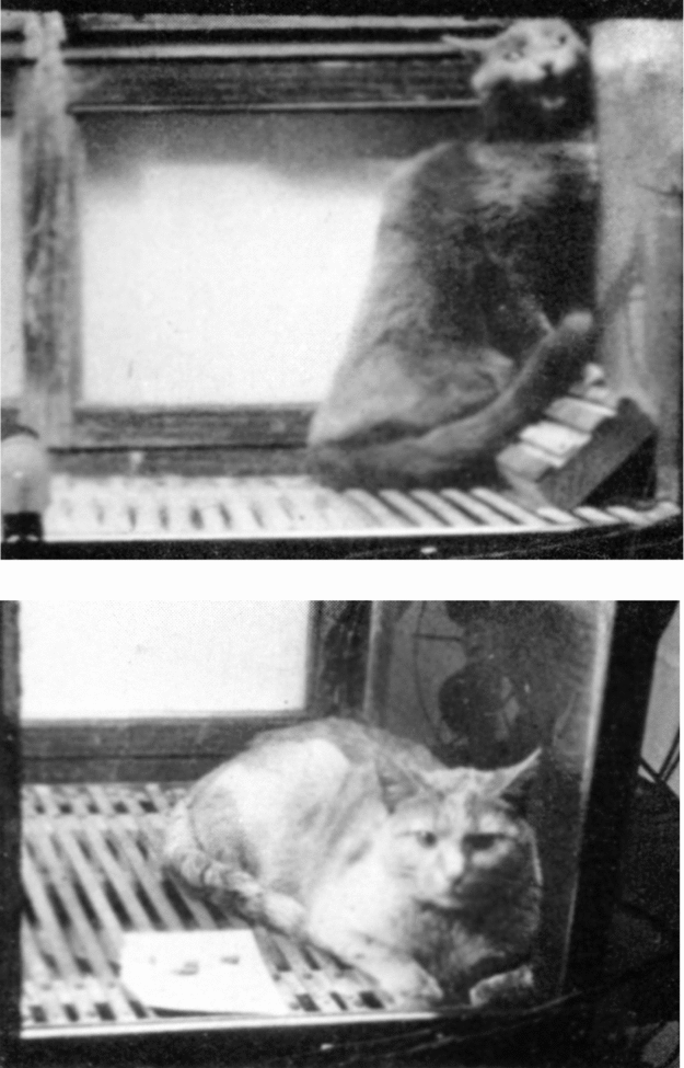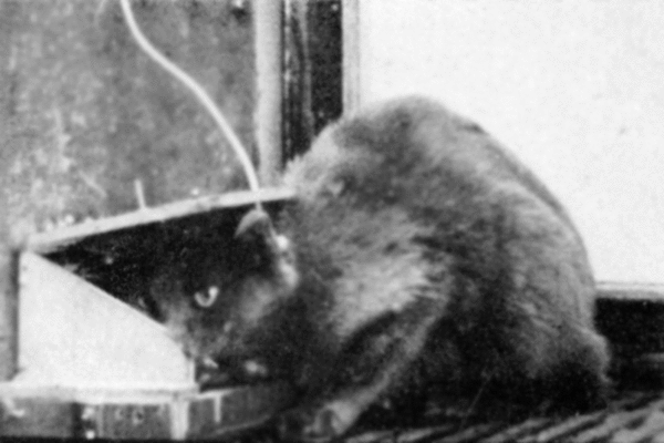 Masserman wrote that after undergoing his torturous procedures, this cat displayed neurotic behavior by putting her head in her food box at the sound of a feeding signal.