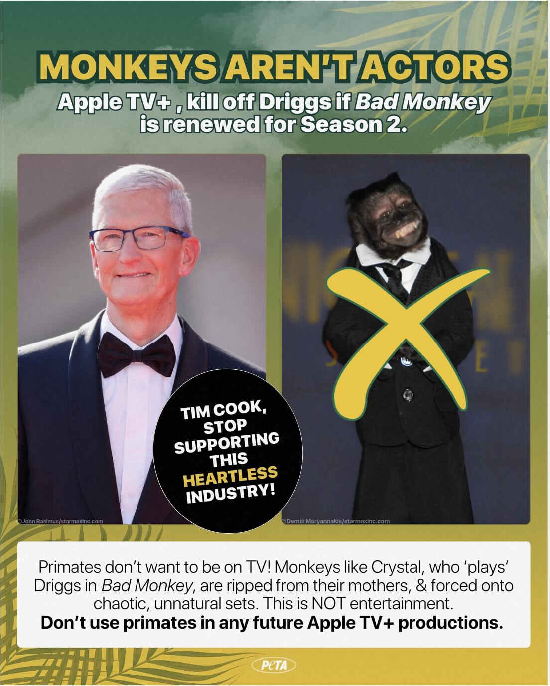 Studies have also shown that using primates in the media fuels a dangerous demand for these animals as “pets.” By contacting Apple CEO Tim Cook, join PETA in urging the company to enact a ban on primates in all future productions to ensure that no monkeys ever suffer for its movies or TV shows again.
