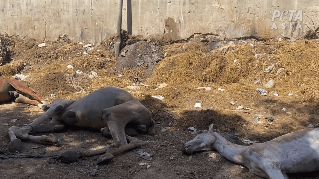 PETA Asia investigators found that horses were routinely whipped, suffering from injuries, and trying to stay alive by eating trash from dumps, while many of the camels had painful wounds and mange. Investigators also found the bodies of dead horses and camels dumped daily in piles of trash just steps away from the pyramids.