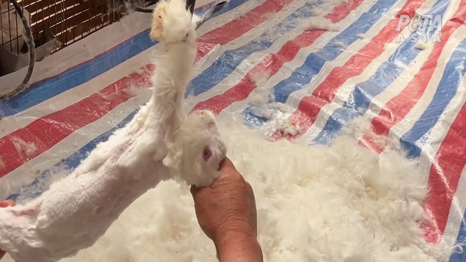 Footage obtained by PETA Asia from several angora wool factory farms in China shows workers tightly tied rabbits’ legs and recklessly shaved off their hair off as while the animals froze in fear. This violent process happens every few months until they die from injury, illness, or are slaughtered when the quality of their hair declines.