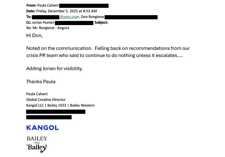 PETA wrote Kangol executives about their angora wool hats, because no rabbit should suffer and die for a hat, and they accidentally copied us on their internal “crisis PR” strategy: “do nothing unless it escalates.”